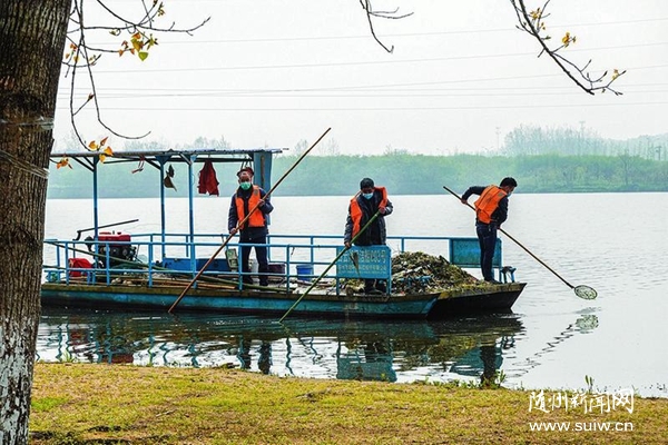 白云湖水管处积极响应爱国卫生倡议,每天组织工人开展湖面垃圾清捞,每周打捞垃圾和漂浮物近万公斤,营造白云湖一湖两岸洁美景观。(随州日报全媒记者李文军摄)
