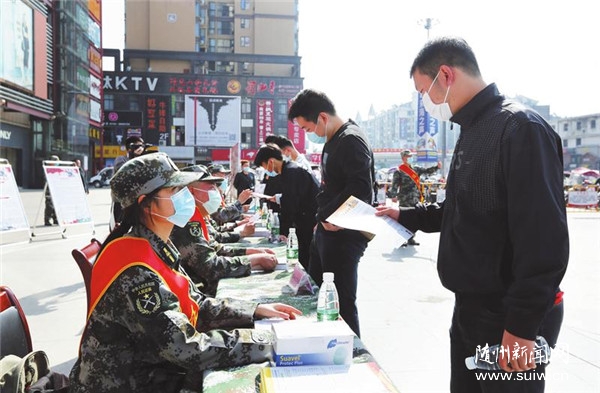 4月15日,随州军分区在大润发广场组织开展2020年征兵宣传,号召适龄青年应征入伍。据了解,受疫情影响,今年征兵时间推迟,上半年征兵工作推迟至下半年一并组织实施,4月1日起至8月15日前广大应征青年可登录全国征兵网报名,8月中下旬组织体检、政考,9月上旬组织定兵,9月中下旬开始起运。 (随州日报全媒记者徐斌摄)