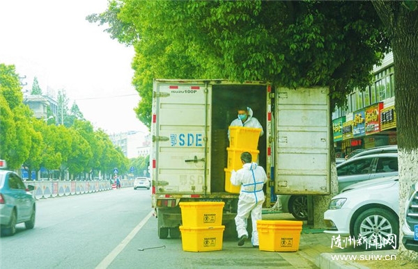 连日来,我市各行各业有序复工复产。图为4月16日,一片净环保公司工人正在医院外收集医疗废物。(随州日报全媒记者李文军摄)