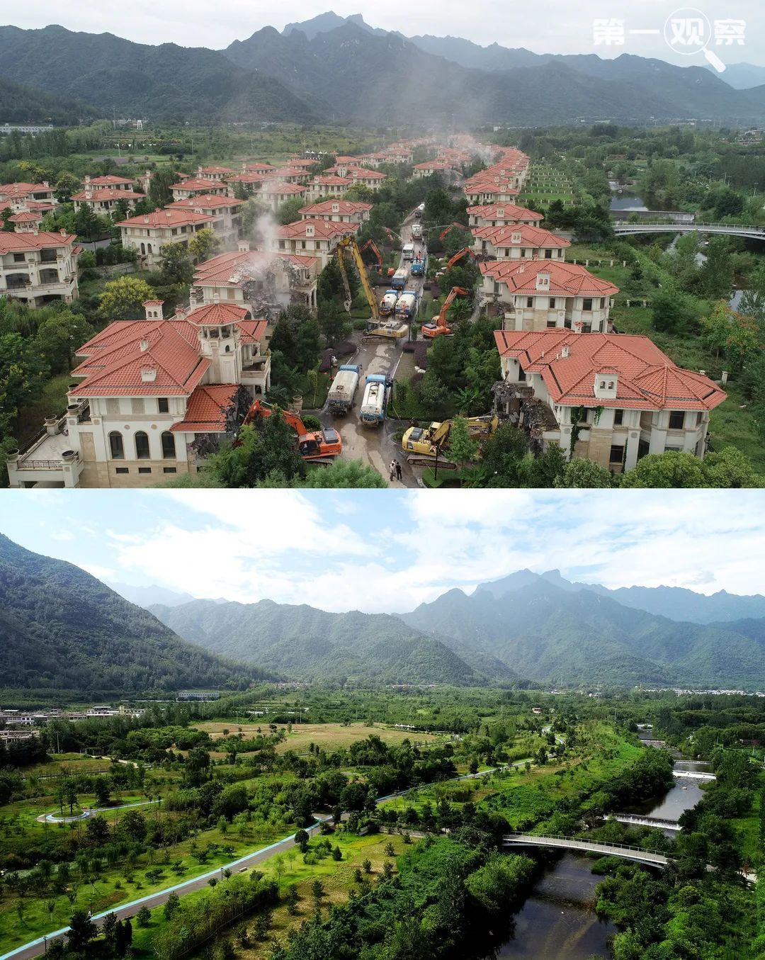 上图为2018年9月,西安市长安区对辖区内东大街道的秦岭违建别墅“群贤别业”进行拆除。下图为2019年7月拍摄的秦岭违建别墅“群贤别业”拆除后建设的秦岭和谐森林公园。