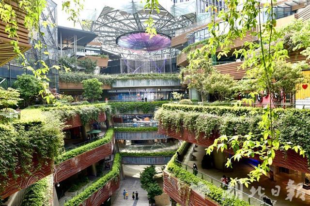 4月19日,武汉群星城购物中心,市民走进这座绿植环抱的“森林商场”休闲购物。(湖北日报全媒记者 李溪 摄)