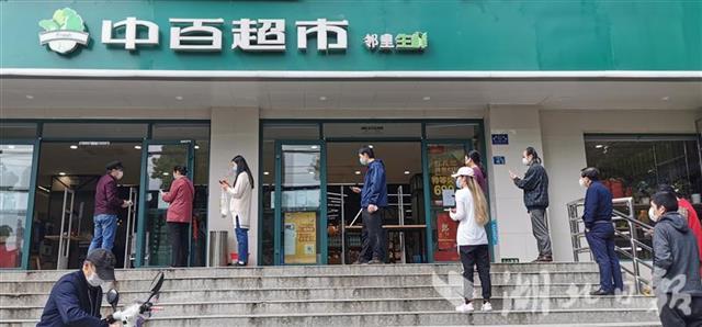 4月19日晨,武汉武昌黄鹂路上中百超市,市民排队扫码测温进入购物。(湖北日报全媒记者 田悦 摄)