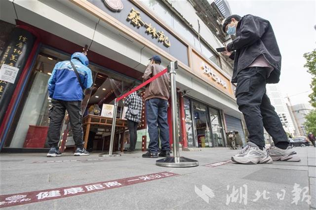 4月16日,汉口新华路一家老字号蔡林记分店,顾客和外卖骑手按照地面标注的健康距离等待取餐。(湖北日报全媒记者魏铼摄)