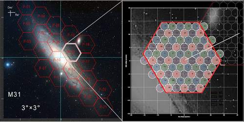 图为用FAST的19波束接收机探测仙女座星系一万亿颗恒星的SETI观测方案。左图中仙女星座被划分成21个六边形区域,右图为其中一个六边形放大细节。可以看到每个六边形区域被19波束接收机四次观测所覆盖,分别由四中颜色显示。