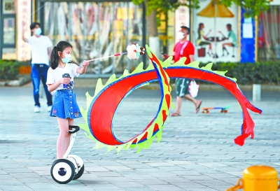 5月3日,在汉阳江滩鹦鹉洲长江大桥桥头下小广场,不少家长带着孩子在此嬉戏。图为一位小朋友在平衡车上舞龙长江日报记者喻志勇摄影报道