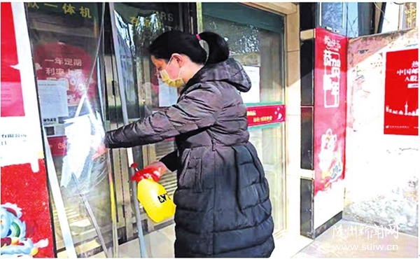 邮储银行随县支行各网点恢复营业,为维护群众身体健康,工作人员每天对营业区域、自助设备等进行消毒。(随州日报通讯员余彬彬摄)