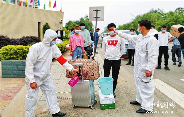 5月6日,我市高三学生复课第一天。图为随州实验中学工作人员对进入校园的高三学生进行严格的体温检测和消毒。(随州日报全媒记者李文军摄)