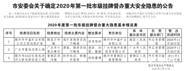 随州市安委会关于确定2020年第一批市级挂牌督办重大安全隐患的公告