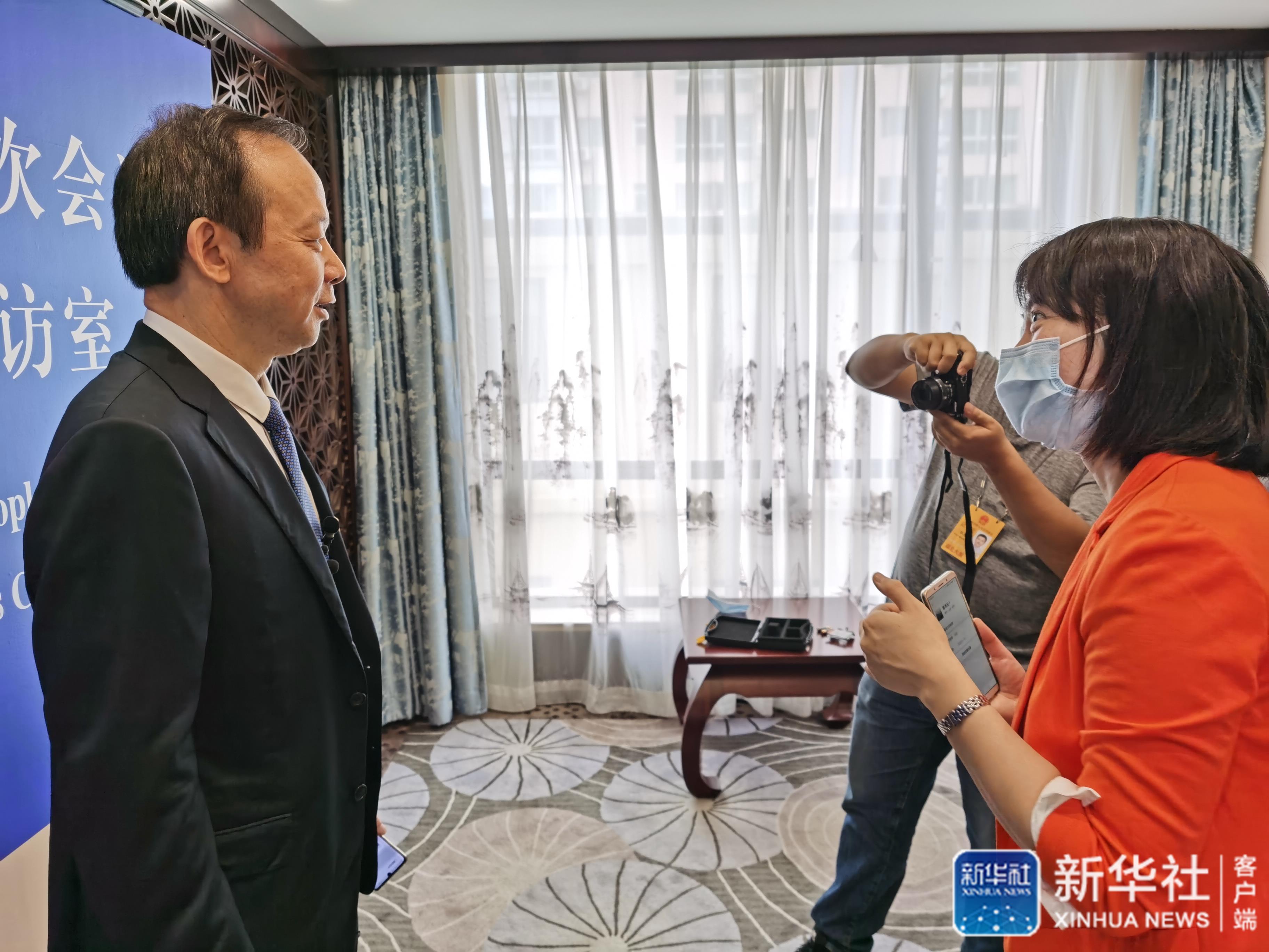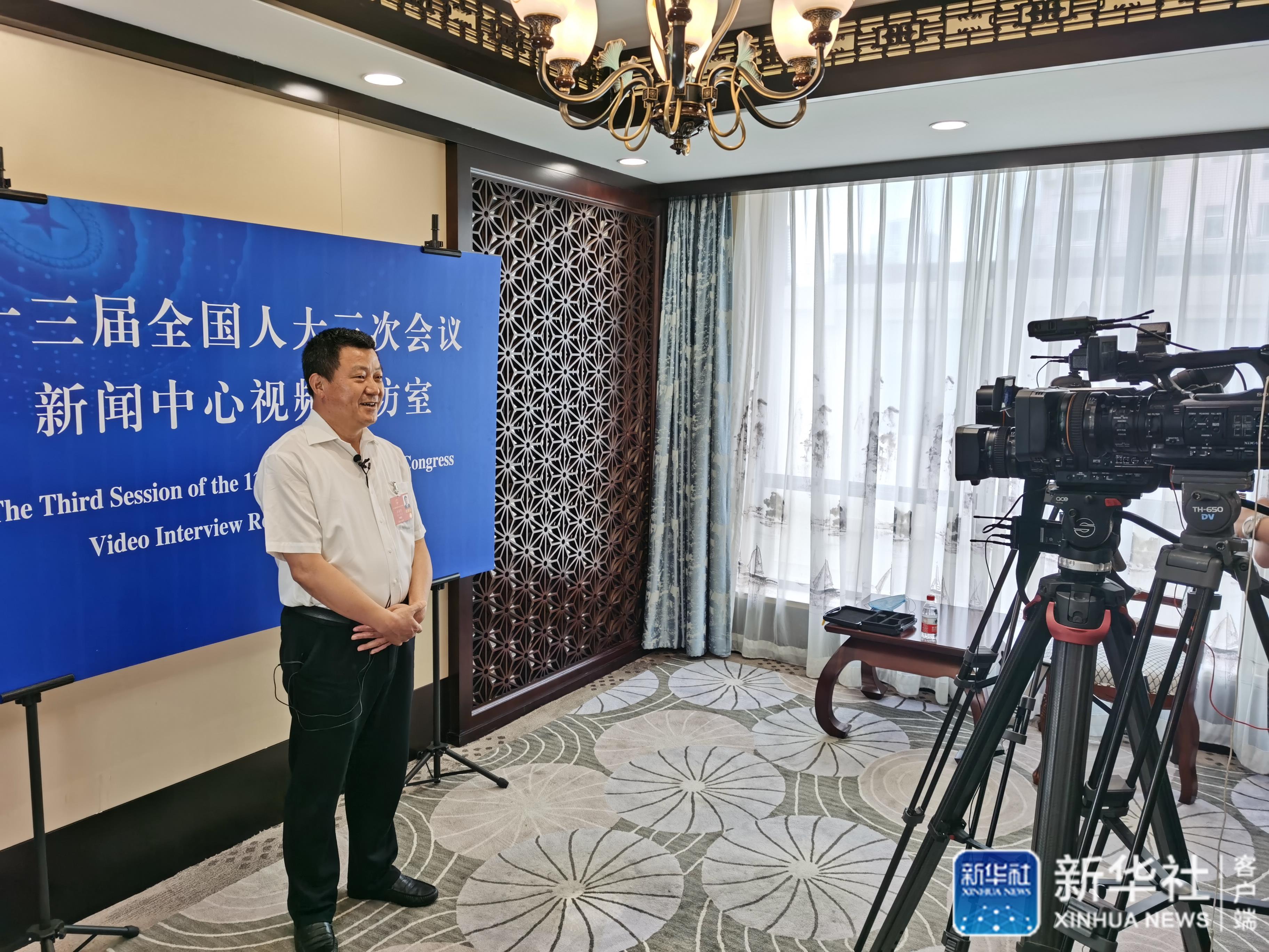 ↑5月21日,全国人大代表李国璋在十三届全国人大三次会议湖北代表团驻地的视频采访室接受采访。新华社记者 梁建强 摄