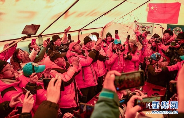 5月27日,登顶成功后,在海拔5200米的珠峰大本营,工作人员开香槟庆祝。新华社记者 晋美多吉 摄