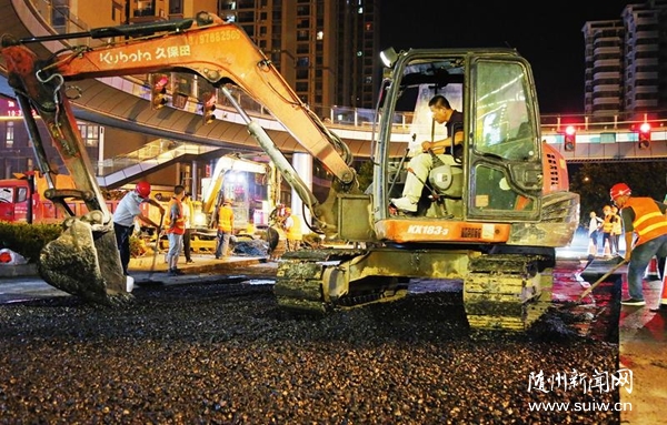夏季是城市道路维修的最佳时机。连日来,为了不影响白天城区道路交通,市城管执法委市政管理处抢抓夜晚时间加班加点,对城区主干道、人行道及附属设施进行修补施工,进一步提高城市道路质量。图为市政工人深夜在大润发天桥下施工。(随州日报通讯员聂少峰、熊家伟摄)