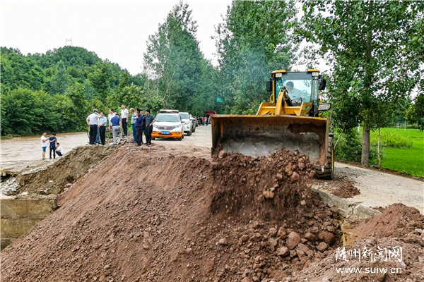 6月27日至28日,强降雨天气导致我市多地出现山体滑坡阻塞交通和水毁道路现象。图为牛程公路随县殷店镇江头店村水毁路段抢修现场。副市长吴超明深入各公路受灾现场查看灾情,指导灾后修复工作。(随州日报全媒记者李文军摄)