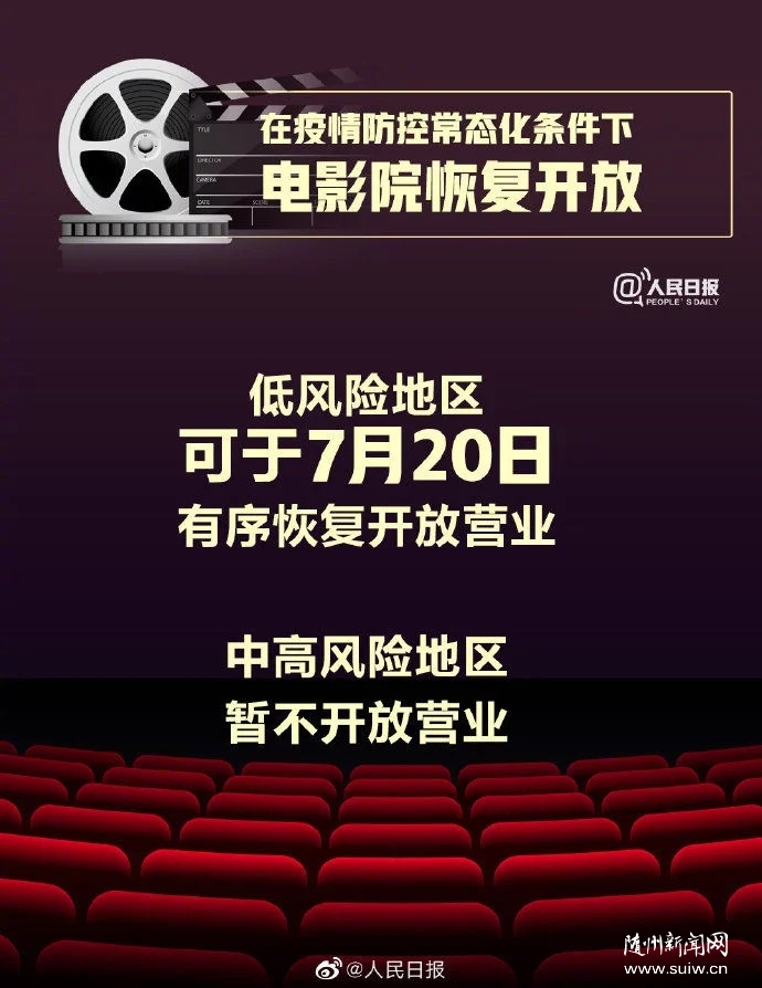 近日,国家电影局发布《关于在疫情防控常态化条件下有序推进电影院恢复开放的通知》称,低风险地区在电影院各项防控措施有效落实到位的前提下,可于