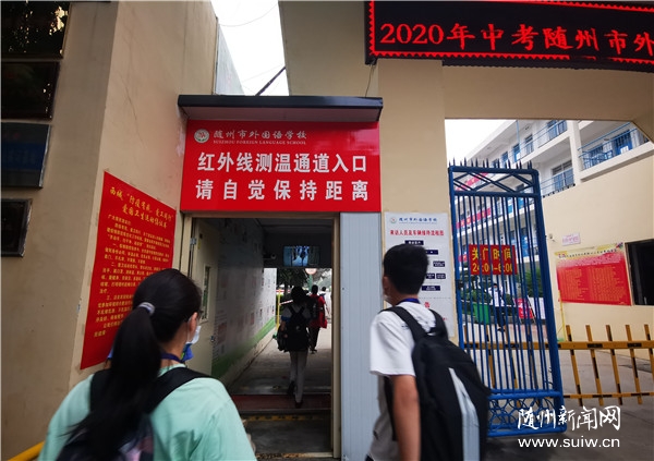 图为7月20日上午,曾都区白云湖学校考点,考生接受体温监测后进入中考考场。(全媒记者徐斌摄)