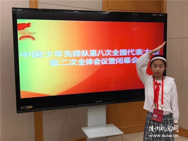 作为少先队员代表参加全国第八次少代会,非常自豪、心情激动!我聆听了习近平总书记为大会开幕发来的贺信,深切感受到了敬爱的习爷爷对少年儿童的关心和关爱。我一定要牢记习爷爷嘱托,在少先队这所大学校里立志向、修品行、练本领,培养热爱党、热爱祖国、热爱人民的情怀。我会将全国少代会的精神原汁原味地分享给更多的少先队员,身体力行,号召全体少先队员学习新思想,做好接班人,为实现中华民族伟大复兴的中国梦时刻准备着!