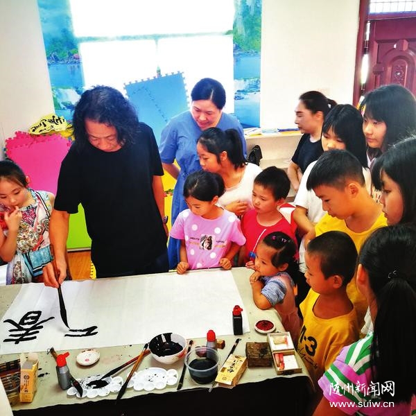 8月29日,曾都区西城飞来土社区组织有音乐、绘画、书法等特长的社区志愿者,来到曾都区何店镇花塆村儿童之家,开展公益联盟活动,让孩子们在活动中聆听乐章、绘制童画、观摩书法,开拓视野,陶冶情操。 (随州日报全媒记者黄闯、通讯员张蕾摄)