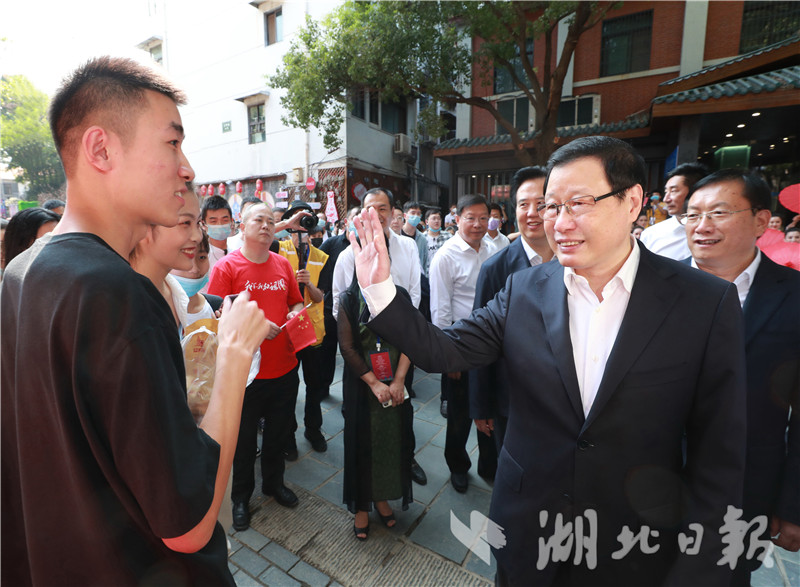 有着“一部活的武昌历史文化教科书”之称的昙华林历史文化街区,店铺鳞次栉比,游客攘来熙往,正在举行的“国庆嘉年华”增添了浓厚的节日气息。应勇来到昙华林主街,察看进出口测温、扫码等常态化防控措施执行情况,走进非物质文化体验馆,同店主和游客亲切交谈,祝大家节日快乐、身体健康。在街区院落,一首原创民谣《昙华林》吸引不少游客驻足,应勇同大家一起欣赏。他指出,街区是体现城市风情、文化底蕴、景观特色的重要载体,要在保护中更新、在更新中更好保护,保留城市历史文化记忆。要结合区域特点,发展更多具有本土特色、广受群众欢迎的文化业态,培育商、旅、文多业态融合的消费新模式,让游客可购、可玩、可体验,让城市生活更美好。