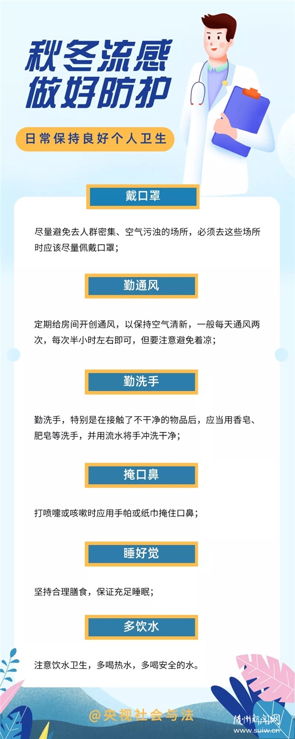 在流感季,为了最大程度上抵御流感,我们要在日常生活中保持良好个人卫生习惯,宜采用以上六大防护措施。