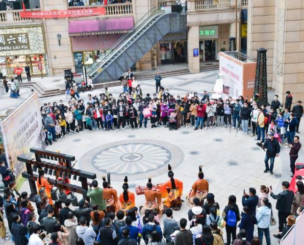 巡演首场在武汉音乐学院举行。活动现场,当缩小版的“曾侯乙编钟”组装完成,该学院的学子们纷纷上前尝试敲响这一古老的打击乐器。市博物馆编钟乐团人员现场讲解国宝曾侯乙编钟的传奇经历、发声原理、珍贵价值等,并现场演绎编钟乐舞。下午,编钟乐舞快闪巡演来到武汉年轻人聚集地光谷步行街。当悠扬灵动的编钟古乐在人来人往的繁华街头敲响,古典与现代的碰撞、空灵与闹市的映衬,让随州的编钟乐舞成功吸晴,成了光谷步行街全场最受瞩目的秀。现场里三层外三层围满了市民群众,大家纷纷举起手机拍照录摄。![]()