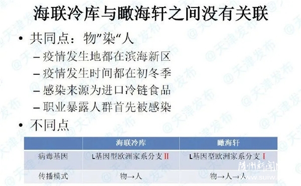 海联冷库经过粗测序,它的病毒基因属于是L基因型欧洲家系Ⅱ分支,瞰海轩属于L基因型欧洲家系Ⅰ分支,它们的上缘是一样的,就像家庭一样,是兄弟两个人,是不同的两个分支,从基因测序上可以判断这两起疫情是完全没有关联性的。