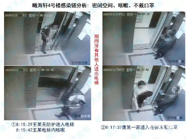 11月9日,感染者王某进入了4号楼的电梯,他没有戴口罩,还在里面咳嗽。跟他相隔不到两分钟的时间,康某一家三口走进了电梯。这里面更关键的细节是康某没有戴口罩,如果当时康某戴口罩,这样的情况可能会避免发生,她感染的概率就会降低,但是很不幸,当时康某进入到电梯的时候是没有戴口罩的。康某和王某之间的流行病学关联就串联上了。