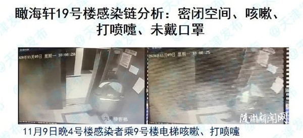 公安干警和疾控人员发现了线索:4号楼第一个发现的感染者王某,在11月9日晚去9号楼找工友。在电梯里王某不但咳嗽,还打喷嚏,没戴口罩。11月10日,申某坐电梯去9号楼找同事,后又返回19号楼,10日下午申某住在9号楼的同事到19号楼聚餐。据检测,9号楼的电梯物表采样新冠病毒核酸检测阳性,而且是多点位的阳性。