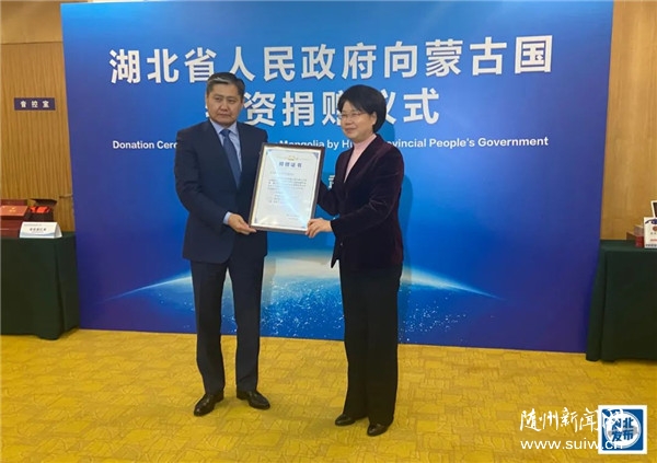湖北省副省长肖菊华向蒙古国驻华大使巴德尔勒递交捐赠证书