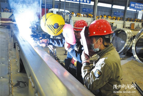 连日来,程力公司环境净化车专业厂加班赶制抑尘车、污水处理车、吸污净化车等订单。据介绍,今年该厂产值同比增长15%以上基本成定局。图为厂长王军(左一)正在为电焊工作示范,确保焊接质量。 (随州日报通讯员石守京摄)