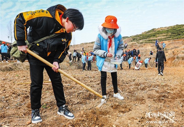 随县洪山镇云峰山万亩茶园景区与湖北(随州)思路研学公司共同打造“校内读万卷书、校外行万里路”校外研学基地,“体验农事艰辛、传承农耕文化”主题户外研学课程让广大中小学生受益匪浅。图为随县小林镇中心学校八年级学生在农事教员的指导下在茶园套种冬豌豆。 (随州日报全媒记者李文军、通讯员叶玲玲、老木摄)