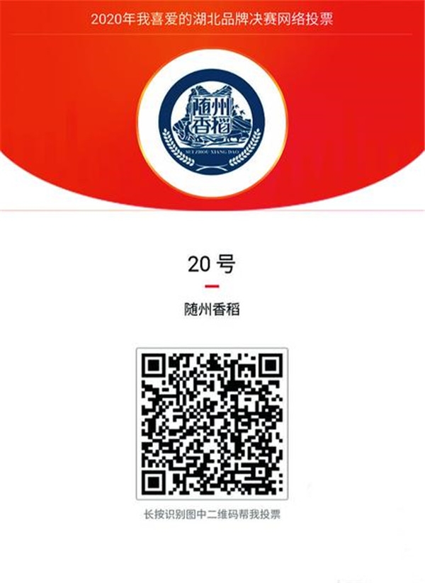 为进一步叫响“随州香稻”品牌,让“随州香稻”香飘千家万户,飘出随州,飘向全国,请扫描微信二维码为家乡品牌助力,每人每天可投10票。