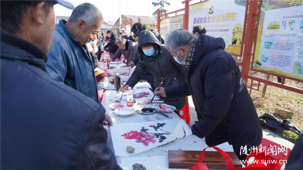 ▲书画家为随县新街镇水寨村的父老乡亲绘制“花开富贵”