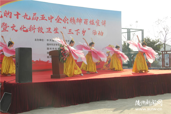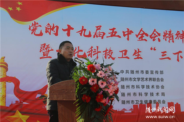 党的十九届五中全会精神“百姓宣讲”暨文化科技卫生“三下乡”活动,由随州市委宣传部、随州市文学艺术界联合会、随州市科学技术协会、随州市科学技术局、随州市卫生健康委员会主办,邀请了书法家、画家、科技专家、医疗专家、文艺工作者等献技献艺,将热热闹闹的“精神集市”送到随州各地父老乡亲家门口。