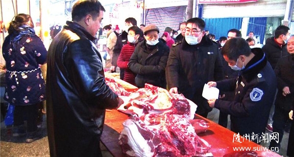 为加强生猪市场监管,日前,广水市农业农村局、公安局、市场监督管理局等单位组成专项整治小组,对该市生猪销售场所进行重点隐患排查,切实抓好动物防疫工作,严打屠宰违法行为,保障群众舌尖上的安全。据了解,专项行动将持续到2月中旬。图为专项整治小组在广水市平靖路农贸市场检查。 (随州日报通讯员张婷、胡浩摄)