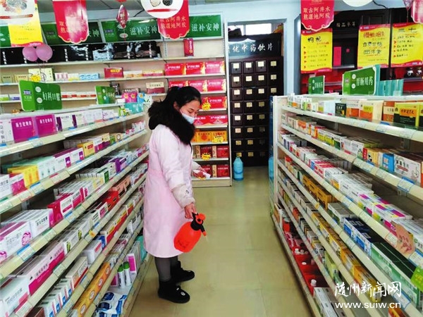 1月19日,好宜好大药房交通大道店工作人员正在对店内环境进行消毒。据介绍,近期我市药店对销售感冒、退热、止咳药品实行凭医院处方实名登记制度。(随州日报全媒记者陈巧玲摄)