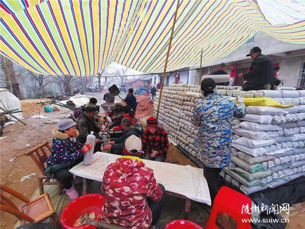 1月25日,曾都区洛阳镇胡家河村二组陈佰银等十几户菇农自发成立的互助组,正在轮流帮助各户装填香菇袋料,为春菇栽种作准备。(随州日报全媒记者李文军摄)