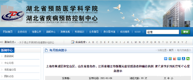 上海市黄浦区和宝山区、山东省青岛市、江苏省镇江市新增无症状感染者和确诊病例 湖北省疾病预防控制中心紧急提示