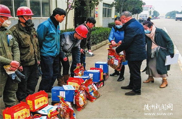 春节将至,曾都区总工会深入各企业开展“曾都留你过大年我们给你送温暖”活动,把党和政府的关怀及时送达广大职工的心坎上。图为曾都区总工会为泰晶电子公司春节期间坚守一线、留曾就地过年的职工送去面条、水果、糕点、口罩等暖心大礼包。(随州日报全媒记者李文军、通讯员谢晓摄)