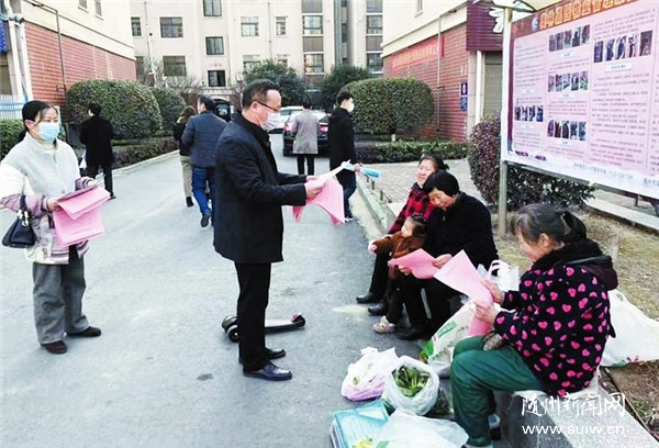 近日,市经信局下沉党员干部在随州高新区十里铺社区开展疫情防控、安全生产、防范诈骗等知识宣传。(随州日报全媒记者陈云、通讯员王莉摄)