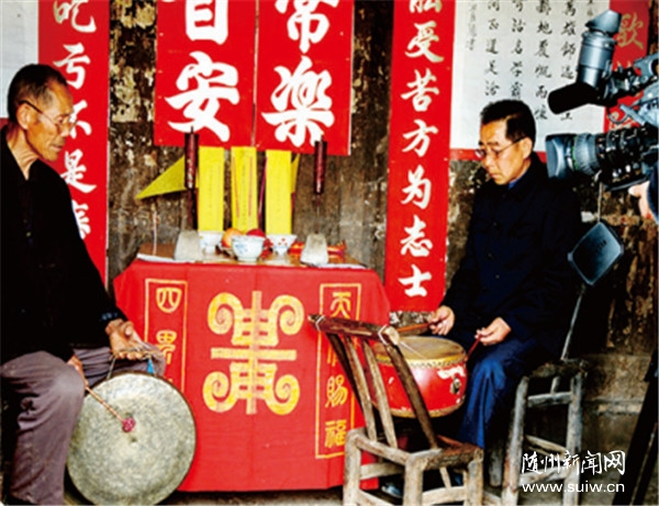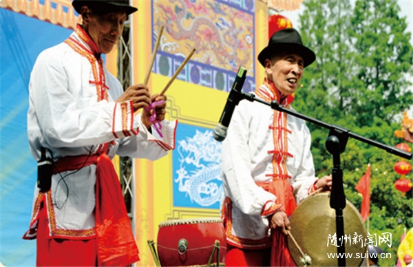 打锣鼓是随州市随县大洪山一带流行的一种曲艺形式,主要用于祭祀。它以锣鼓间奏,由歌师吟唱,是带有史诗性质的“仪式歌”。随县大洪山一带过去长时期保留了“信鬼而好祀”的古老传统,人们为消灾祈福,求神许愿,常以打锣鼓的方式来举行祭祀活动。打锣鼓所信奉的是大宋钦封的“五显真君”,当地人尊其为喜神,据当地人说向喜神许愿后特别灵验,故形成请人打锣鼓这一奇特风俗。打锣鼓演唱调式以宫调和徵调为主,主旋律为宫调。唱词内容以史前创世神话为主。其表演形式:一种是3人或5人于室内坐堂而唱,谓之“堂鼓”。另一种是29人以上的队伍于室外边歌边舞,谓之“抟鼓踏歌”。