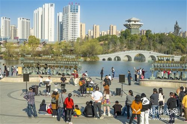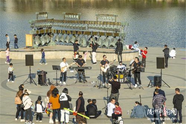 近日 ,春暖花开,市民纷纷走出家门来到公园放风筝、赏花,感受春天的气息。图为多芬琴行正在随州文化公园举行音乐会,吸引了许多游人驻足欣赏。 (随州日报全媒记 者李文军摄)