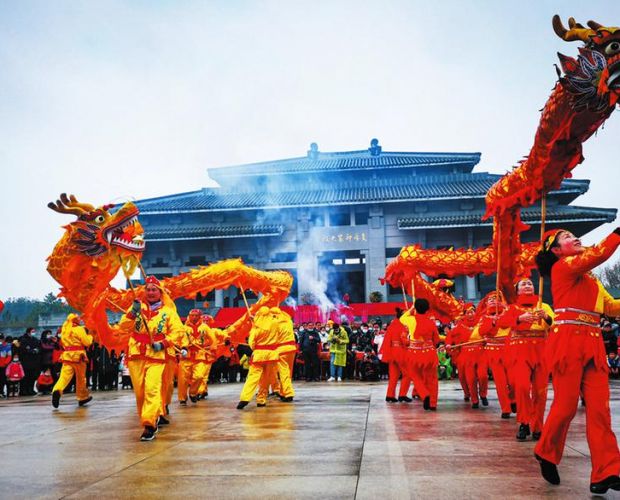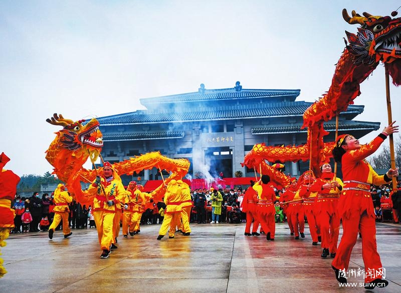图1为两支舞龙队在炎帝故里景区谒祖广场进行民俗节目表演。(随州日报全媒记者李文军摄)