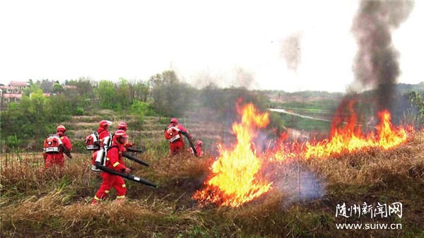 3月30日,广水市林业部门组织半专业扑火队在十里街道办事处千户冲村开展森林防火应急演练,现场检验应急扑救实战能力。(随州日报特约记者刘冬、通讯员张婷、毛貌摄)