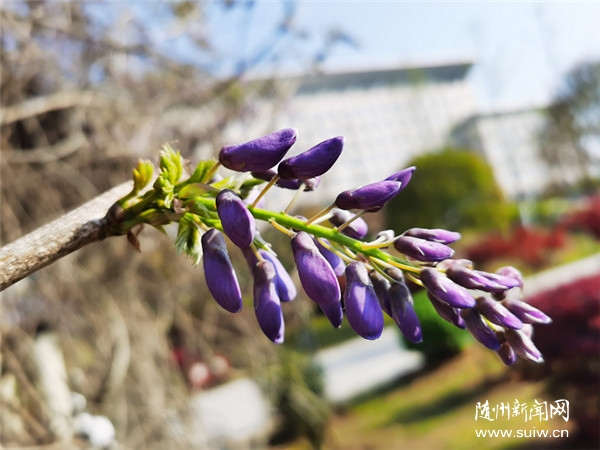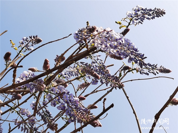 在随县新县城广场的木质长廊上,缠绕着数不清的紫藤。错杂的藤蔓带着深沉,交织在深棕色的墙架上,错落有致。在某个不经意的夜晚,纠缠的枯枝上渐渐吐露出新绿的嫩蕾,仿佛一夜间,紫藤花便已悄然开满枝头。