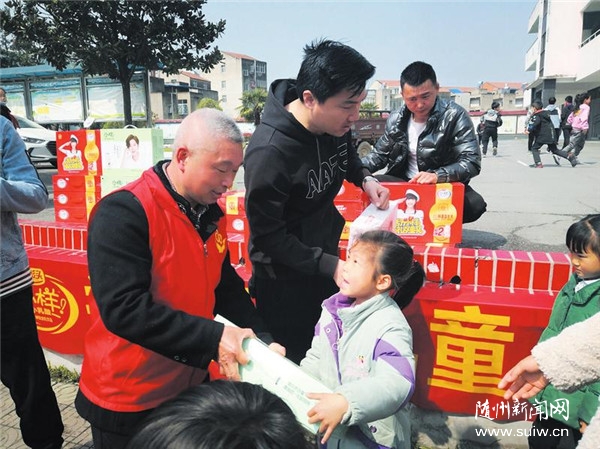 近日,广水市广善义工联合会携手四川好彩头实业股份有限公司、广水市小胡副食商行的志愿者们来到广水市关庙中心小学看望留守儿童,给孩子们送去关怀。 (随州日报通讯员刘小斌、程开军摄)