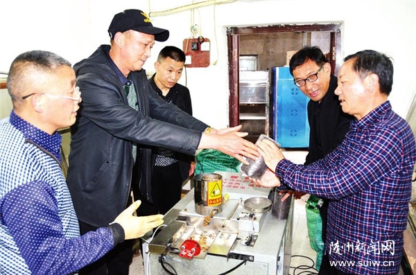 随县厉山镇灯塔菌种厂使用一种新型点种机,1小时可点700多袋菌种。图为4月22日,机械工程师向市食用菌专家介绍机械点种情况。(随州日报通讯员石守京摄)