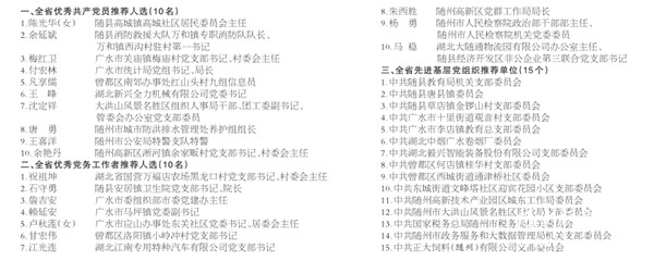 根据《中国共产党党内功勋荣誉表彰条例》和《湖北省党内表彰实施办法》的相关规定,省委决定,在中国共产党成立100周年之际,表彰全省优秀共产党员、全省优秀党务工作者和全省先进基层党组织。严格按照推荐、比选、征求意见、考察、集体研究等程序,经市委研究同意,确定10名共产党员、10名党务工作者、15个基层党组织为全省“两优一先”表彰推荐对象,现将推荐对象名单予以公示。
