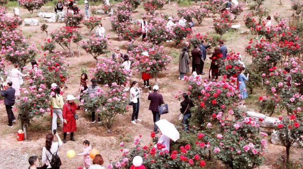 月季观光园内,鲜花正艳,游人如织。一朵朵月季花红的似火、粉的似黛、白的似雪……古桩月季、藤本月季、地被月季等十多个品种的月季花芬芳馥郁、争奇斗艳。游客徜徉其间,或合影拍照、或观赏点评,流连忘返。