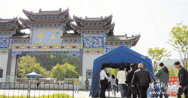 4月28日,经整修后,三潭风景区重新开园,迎来首批游客。图为游客们佩戴口罩、检测体温后有序进入景区。(随州日报特约记者程淇、通讯员卢佳摄)