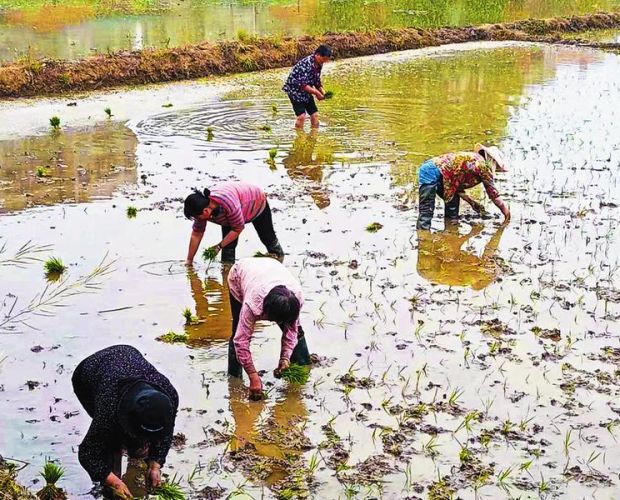 雨后初晴,随州高新区淅河镇魏家老湾村日前组织农民互帮互助,保水灌田,抢播秧苗。