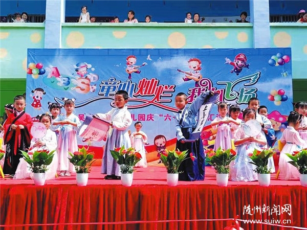 广水市吴店镇中心幼儿园日前举行以“童心灿烂、我心飞扬”为主题的庆祝“六一”儿童节文艺汇演活动。舞蹈、情景剧、健身操轮番上演,台上热闹非凡,台下掌声、欢笑声不断。(随州日报特约记者温文雅、通讯员高冬梅摄)